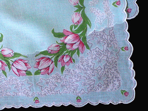 New old stock vintage hanky with a pink tulip wreath and a botanical shadow print (closeup in second photo). Colors are shades of aqua, pink, green, white and sheer gray. Made of cotton, and measuring 14.5 inches with scalloped edges. Pristine as found.