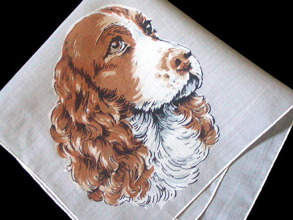 This charming vintage hanky presents a finely detailed cocker spaniel dog in one quadrant. Made of cotton, it measures about 12.5 inches and has white hand-rolled hems. Colors are shades of brown, gray, white, and black on a gray background.