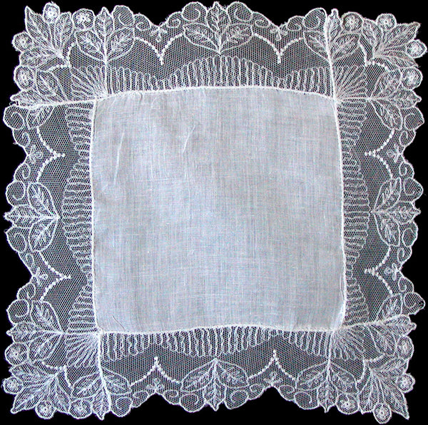 Never used vintage wedding handkerchief embellished with an Art Deco styled lace, all in white. Measuring 11.5 inches square with a linen center. Although never used, the last photo shows a closeup of the lace as well as a small, insignificant tear. Otherwise, pristine.