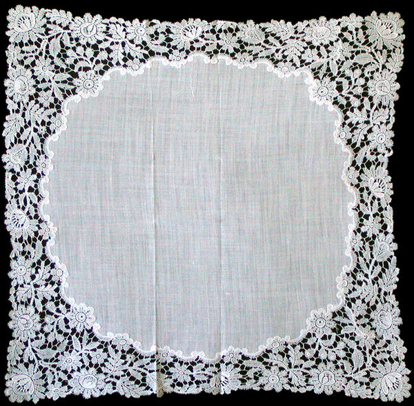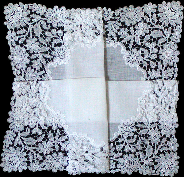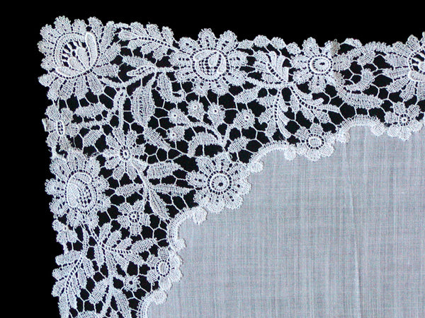 Never used vintage wedding handkerchief with Schiffli lace. All white. Measuring 12 inches with a fine cotton center. A graceful bridal accessory in pristine condition.