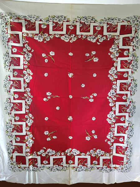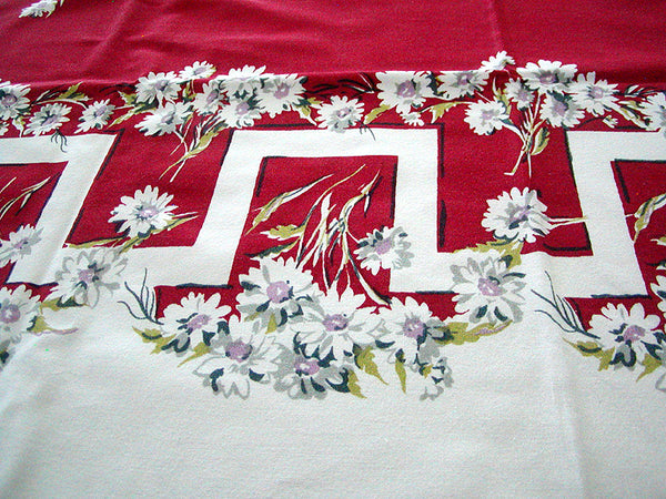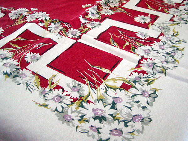 This vintage tablecloth showcases a geometric border decorated with white daisies and subtle accents of lavender, gray, chartreuse, and black set against a red background. Made from a medium-weight cotton blend, it offers a soft drape and measures approximately 53x60 inches. In very good condition with no stains or flaws, this preowned cloth displays gentle color softening, but not much. Freshly laundered and clean, it is ready for your table.